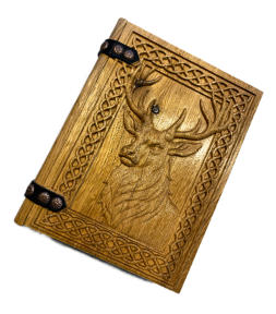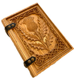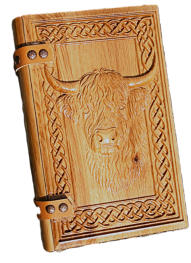 Scottish Medium sized size box made from oak, featuring choice of Scottish themed designs - Thistle, Highland Coo and Stag. They feature leather hinges and can be lined with leather/suede or tartan fabric.